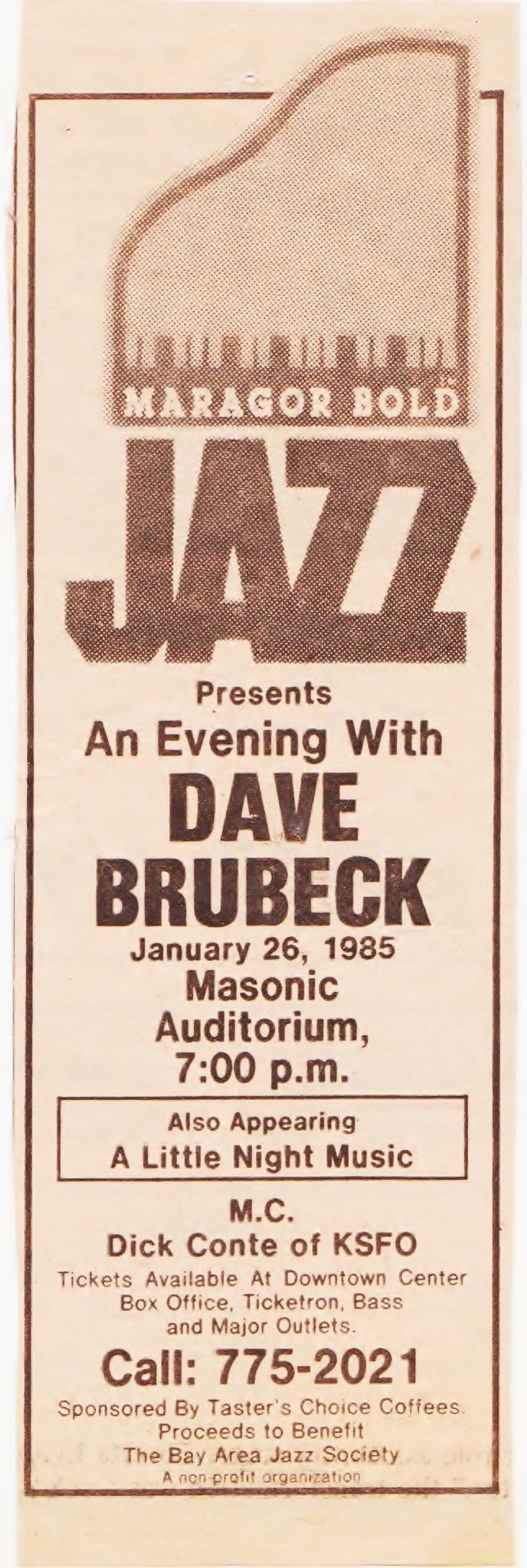 In January of 1985, my west coast jazz sextet, Night Music, somehow finagled its way into opening a concert for Dave Brubeck and his quartet. The gig was at the Masonic Auditorium in San Francisco.